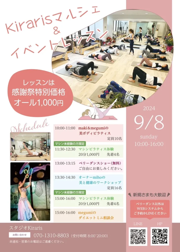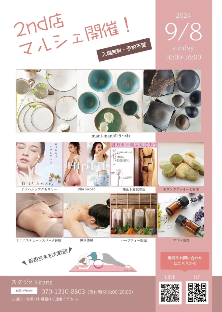 『キラリスマルシェ&イベントレッスン』が開催決定! 2024年8月19日 お知らせ 9月8日(日)10時〜16時『キラリスマルシェ&イベントレッスン』が開催決定!枚方市駅Tサイト前店ではイベントレッスンが感謝祭特別価格で、オール1,100円!(要予約) キラリス2nd店では陶器、雑貨や美容グッズ、アロマ販売、鍼灸体験ができるマルシェを開催!(入場無料・予約不要) 1日限りのキラリスを知り尽くせるイベント、なかなかないこの機会にぜひキラリスの雰囲気を体感してみて下さい URL Copied!